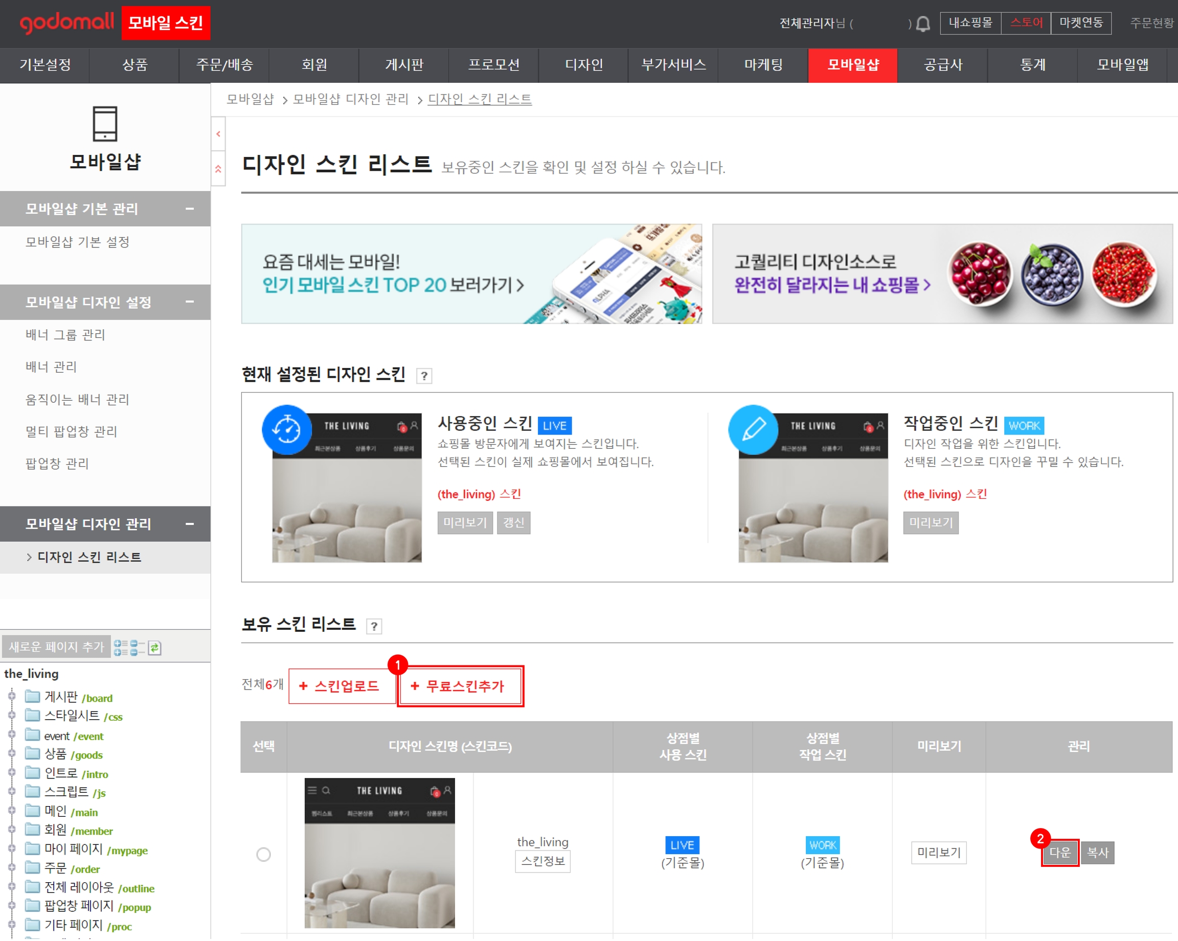 PC 스킨은 [디자인 > 디자인관리 > 디자인 스킨 리스트] 페이지로, 모바일 스킨은 [모바일샵 > 모바일샵 디자인 관리 > 디자인 스킨 리스트] 페이지로 접속해 주세요.