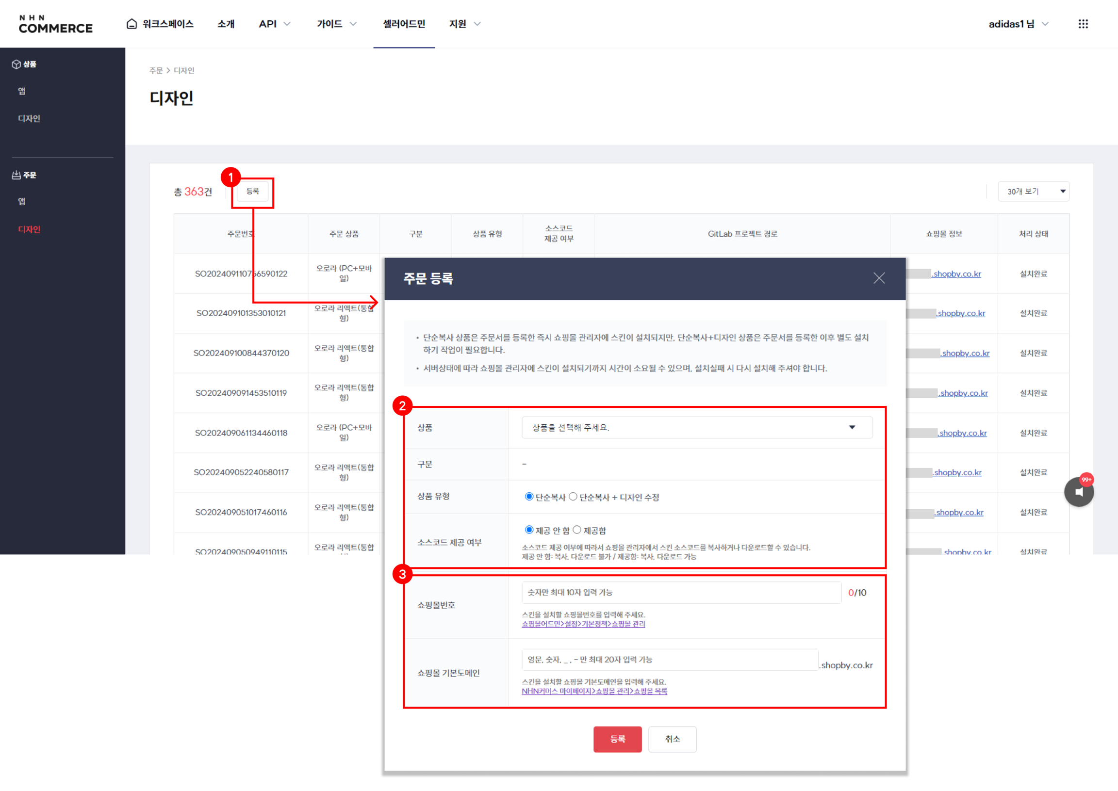 [워크스페이스 > 셀러어드민 > 주문 > 디자인]에서 스킨을 등록합니다.